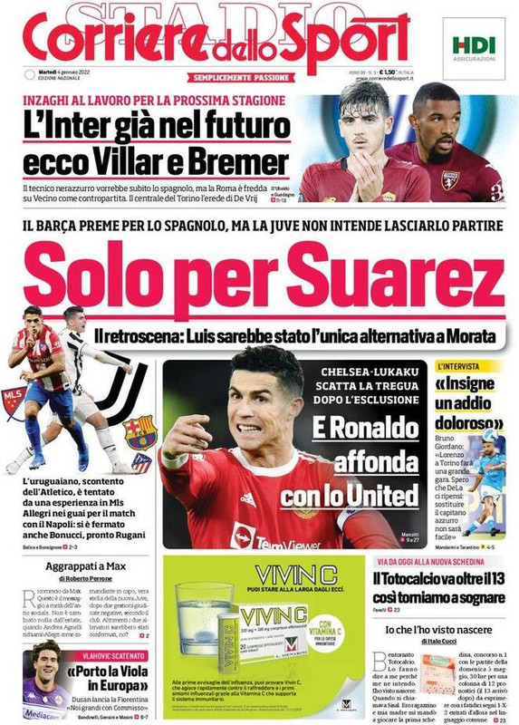 Il Corriere dello Sport in primo piano titola sulla questione attaccante della Juventus: "Solo per Suarez". In taglio alto spazio all'Inter: "Ecco Villar e Bremer".