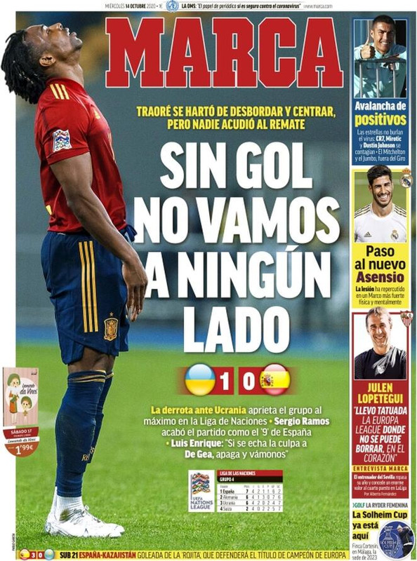 MARCA - "Senza gol non andiamo da nessuna parte", così apre la prima pagina del quotidiano spagnolo Marca. La Spagna perde 1-0 contro l'Ucraina.