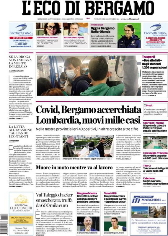 L'ECO DI BERGAMO - "Covid, Bergamo accerchiata. Lombardia, nuovi mille casi", questo il titolo di apertura della prima pagina del quotidiano bergamasco l'Eco di Bergamo.