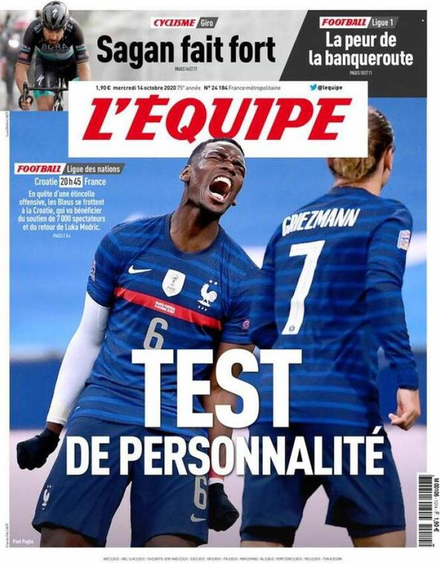 L'EQUIPE - "Test di personalità", questo il titolo di apertura del quotidiano francese l'Equipe. La nazionale francese sarà infatti impegnata questa sera contro la Croazia, alle ore 20:45.