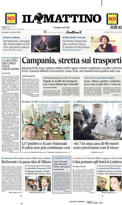 IL MATTINO - Sulla prima pagina de Il Mattino, in evidenza la positività di Ronaldo e la situazione legata al mondo del pallone: "CR7 positivo e il caso Nazionale. Il calcio non può continuare così".