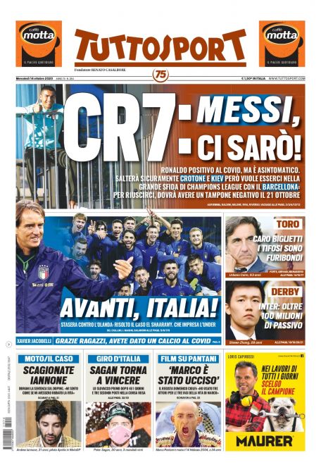 TUTTOSPORT - Sulla prima pagina di Tuttosport, ancora Cristiano Ronaldo: "CR7: Messi, ci sarò! Ronaldo positivo al Covid, ma è asintomatico. Salterà sicuramente Crotone e Kiev, però vuole esserci nella grande sfida di Champions League con il Barcellona. Per riuscirci, dovrà avere un tampone negativo il 21 ottobre". "Avanti Italia! Stasera contro l'Olanda: risolto il caso di El Shaarawy. Che impresa l'Under". Torino: "Caro biglietti. I tifosi sono furibondi". Derby di Milano: "Inter, oltre 100 milioni di passivo".