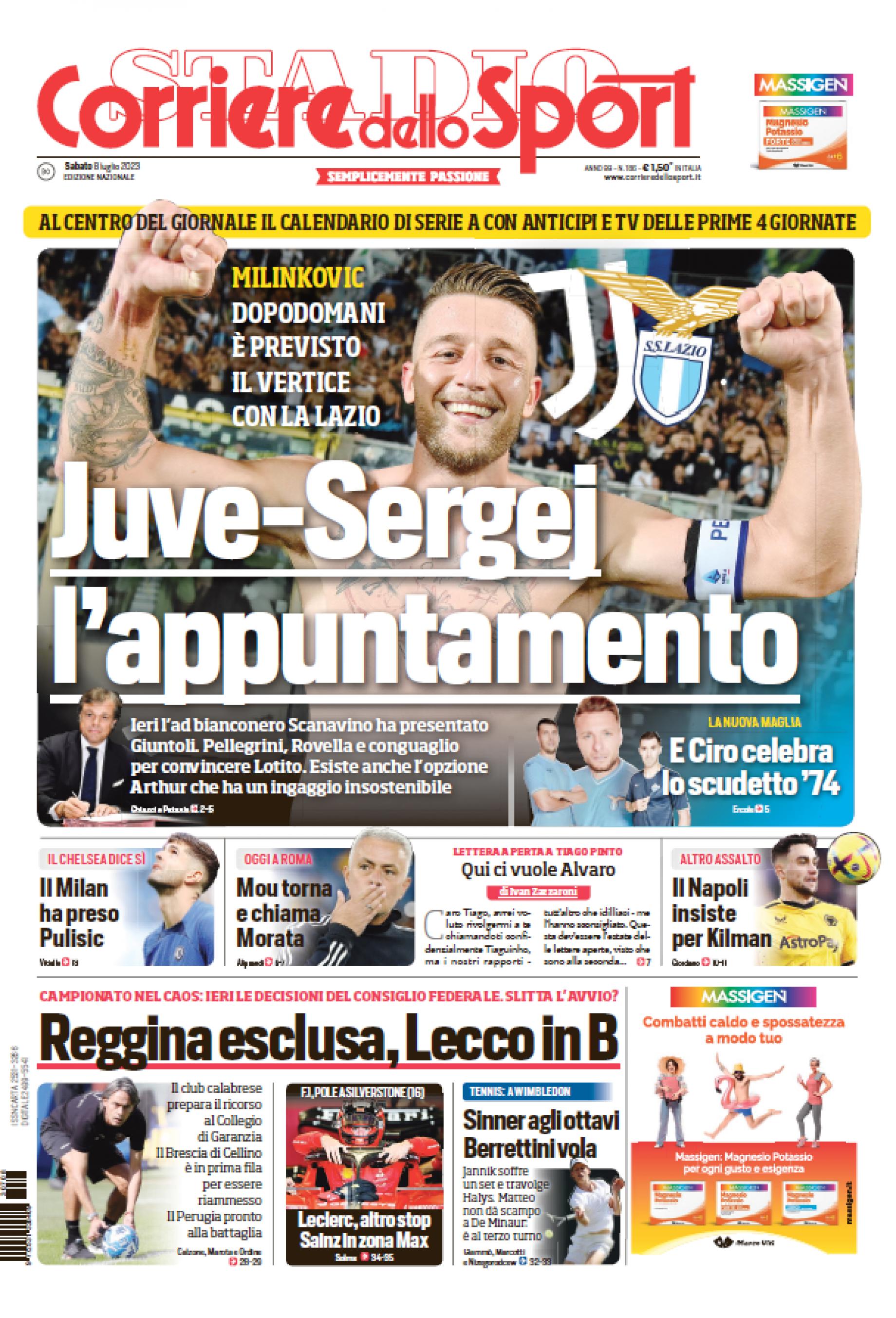 Il titolo scelto per l'edizione odierna del Corriere dello Sport è "Juve-Sergej, l'appuntamento", riguardante il vertice fra Juventus e Lazio per parlare del futuro di Milinkovic-Savic. Spazio anche all'insediamento di Giuntoli come nuovo Football Director bianconero e alla chiusura dell'accordo Milan-Pulisic.