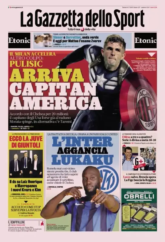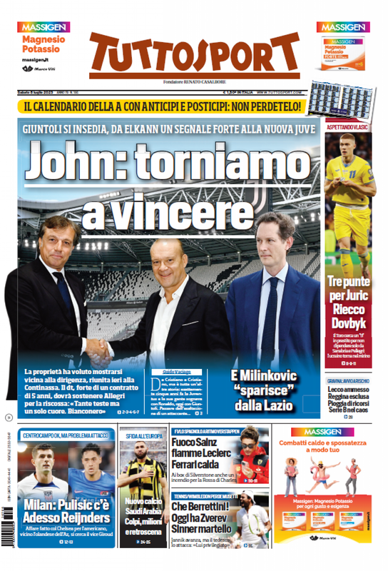 Anche Tuttosport dedica ampio spazio alle novità in casa Juventus: il titolo "John: torniamo a vincere" è sempre legato all'arrivo di Giuntoli, affianco si legge "E Milinkovic 'sparisce' dalla Lazio", mentre in basso la testata dà rilievo alla chiusura dell'accordo per Pulisic al Milan.