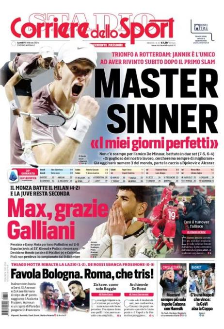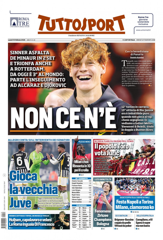 Tuttosport dedica la prima pagina alla vittoria di Sinner contro de Minaur al Rotterdam Open: da oggi il tennista altoatesino è il n° 3 al mondo. In basso spazio alle ultime in casa Juve, dove oggi è in programma un confronto tra Allegri e i giocatori. Sempre a Torino, ovazione per Ivan Juric da parte dei tifosi granata.