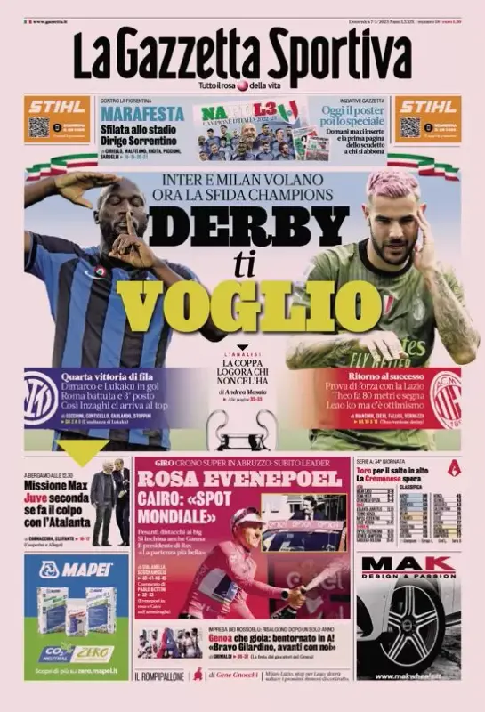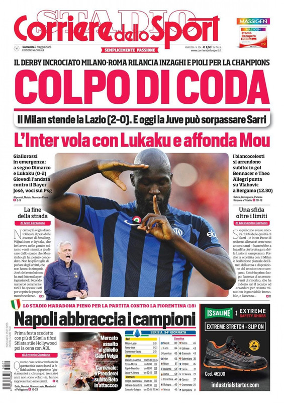 Le prime pagine dei quotidiani sportivi in edicola oggi, domenica 7 maggio, si focalizzano sulla trentaquattresima giornata del campionato di Serie A, cominciata oggi con le vittorie di Milan e Inter contro Lazio e Roma. Spazio quindi ai successi di rossoneri e nerazzurri, anche in ottica derby Champions (in programma mercoledì). Non mancano anche i riferimenti al programma di questa domenica, e in particolare al match delle 12:30 del Gewiss Stadium fra Atalanta e Juventus. Spazio poi per il Napoli "scudettato" e per il Genoa promosso in A dopo un anno in Serie B.