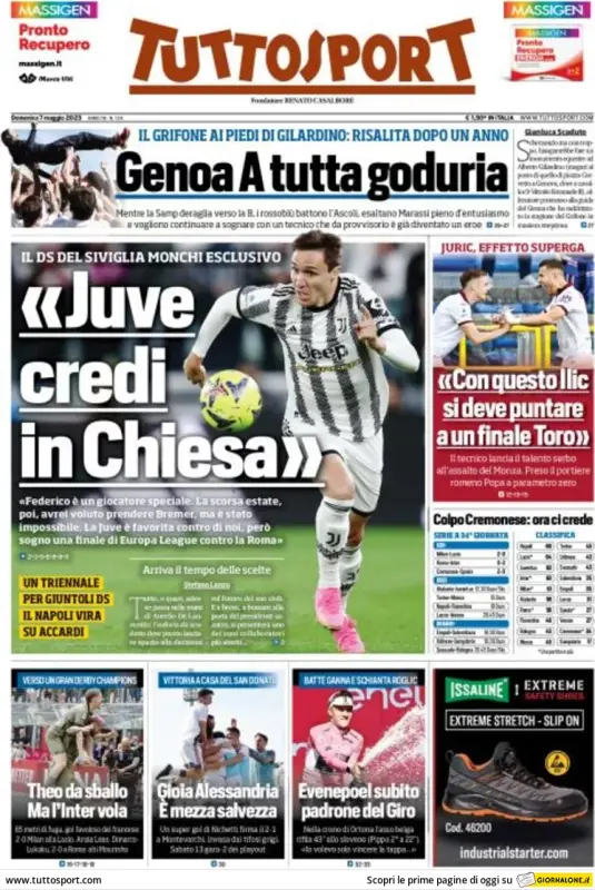 Tuttosport apre con un'intervista al direttore sportivo del Siviglia, Monchi: "Juve, credi in Chiesa". In taglio alto: "Genoa A tutta goduria". In taglio laterale, le parole di Juric alla vigilia del Monza: "Con questo Ilic si deve puntare a un finale Toro". Infine, in taglio basso, il Milan e l'Alessandria: "Theo da sballo, ma l'Inter vola"; "Gioia Alessandria, è mezza salvezza".