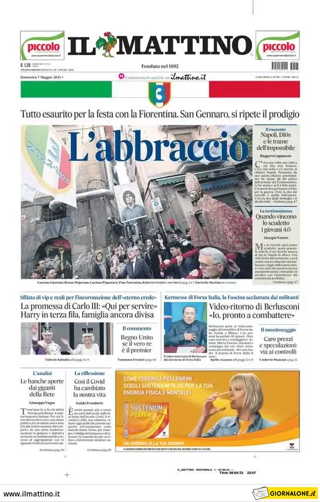 Il Mattino di Napoli apre coi festeggiamenti per il terzo scudetto degli azzurri: "L'abbraccio. Tutto esaurito per la festa con la Fiorentina. San Gennaro, si ripete il prodigio".