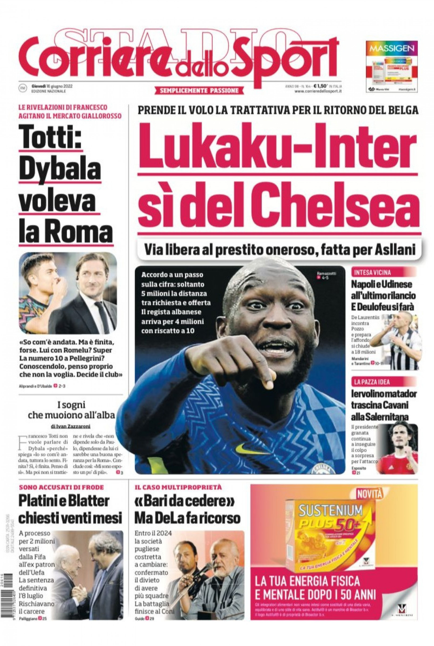 Il "Corriere dello Sport" dedica il taglio centrale della prima pagina alla trattativa tra Inter e Chelsea per riportare Lukaku in nerazzurro. Spazio in taglio laterale per le parole di Totti su Dybala e la Roma.