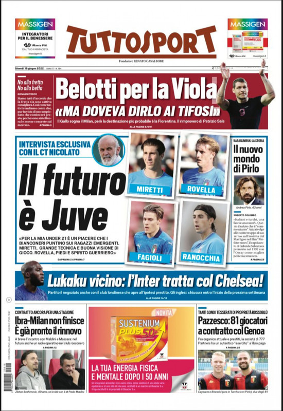 "TuttoSport", in taglio alto si concentra sul futuro di Andrea Belotti, accostato alla Fiorentina. Spazio anche a un'intervista al CT dell'Under 21 Paolo Nicolato e alla trattativa tra Chelsea e Inter per il ritorno di Romelu Lukaku.