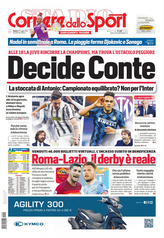 Le prime pagine dei quotidiani sportivi oggi in edicola aprono con il finale di Serie A, in un sabato che apre il turno e subito promette spettacolo, con la sfida fra Juventus e Inter e il derby di Roma. Spazio anche al calciomercato, dopo le dichiarazioni dell'agente di Cristiano Ronaldo, Jorge Mendes, che ha escluso un ritorno del portoghese in patria.