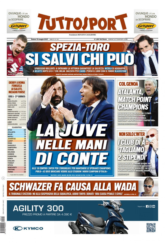 TUTTOSPORT - Tuttosport apre con la sfida dello Stadium: "La Juve nelle mani di Conte. Alle 18 contro l'Inter per l'orgoglio e per mantenere le speranze champions". In taglio alto la gara del Torino: "Spezia-Toro, si salvi chi può", a lato il momento della squadra di Gasperini: "Atalanta, match point champions" e i problemi economici delle squadre italiane: "Non solo l'Inter, i club di A: "Tagliamo due stipendi"