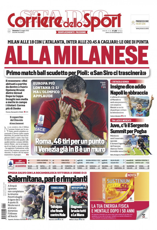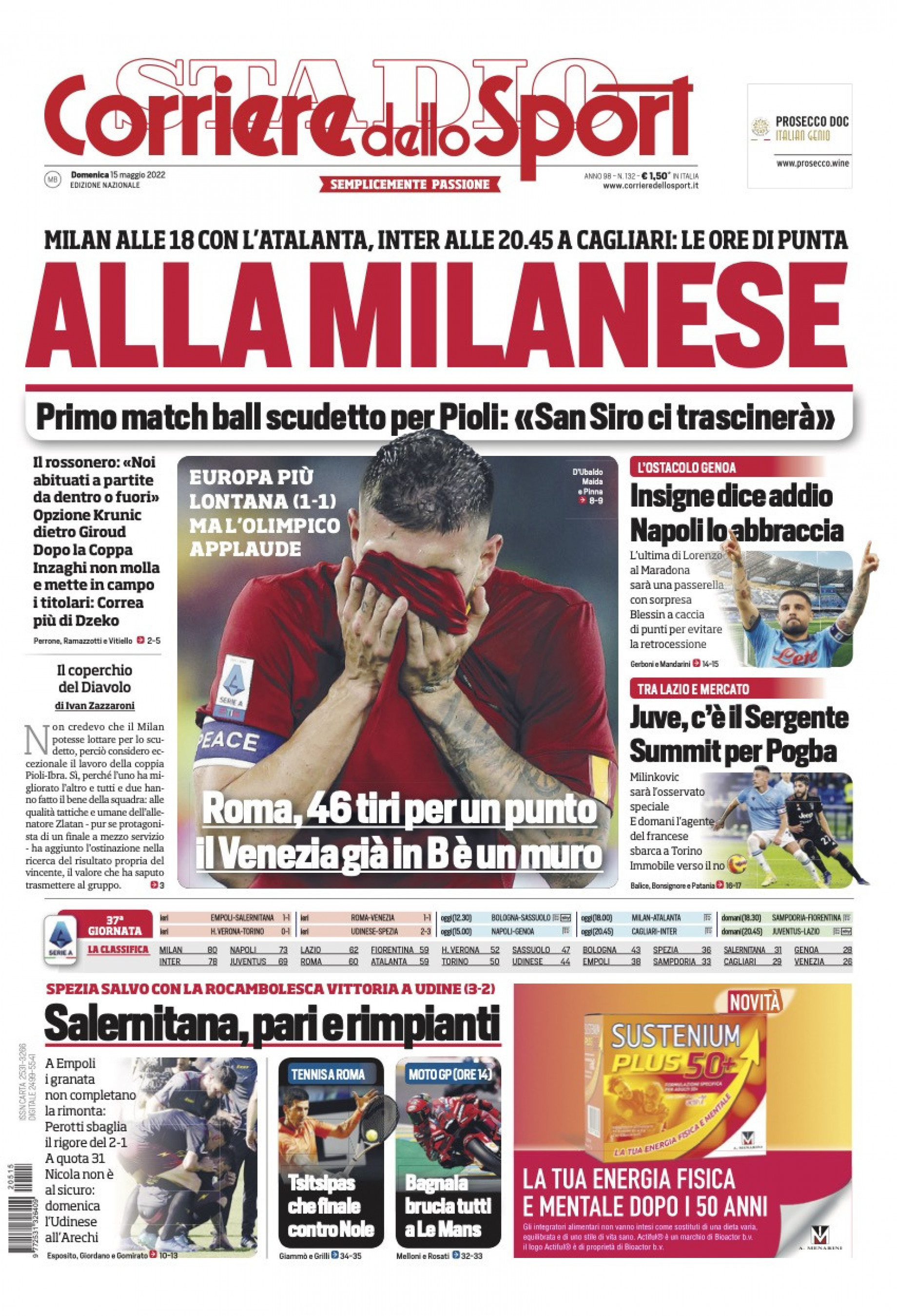 Quella del 15 maggio sarà una serata "Alla milanese", come titola anche il Corriere dello Sport nella sua apertura. Alle ore 18 il Milan affronterà l'Atalanta a San Siro, mentre il Cagliari ospiterà l'Inter - fresca di vittoria della Coppa Italia - all'Unipol Domus, alle ore 20.45. "Insigne dice addio, Napoli lo abbraccia".
