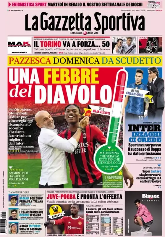 La Gazzetta dello Sport apre con la lotta per il vertice: "Domenica da scudetto. Una febbre del diavolo. Inter, Inzaghi ci crede".