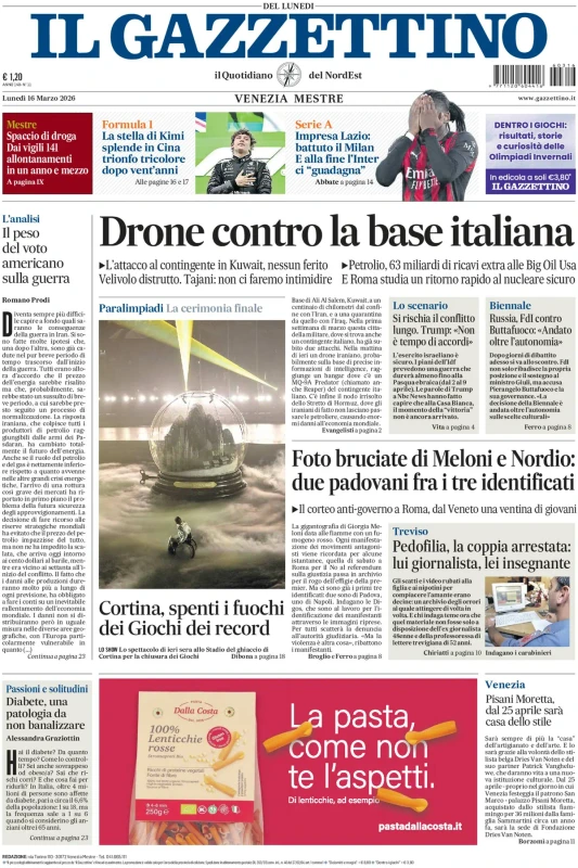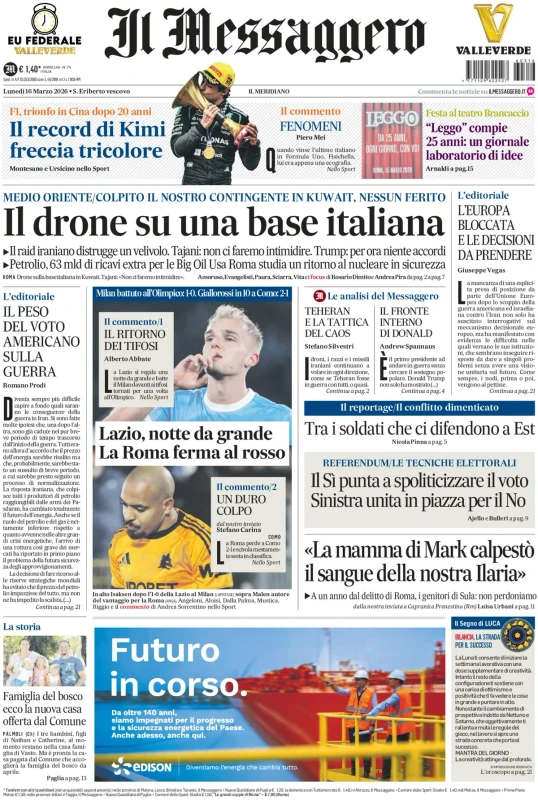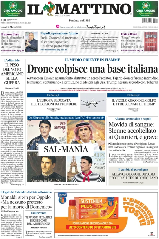 Focus sul Napoli, la 29esima giornata di Serie A, i risultati dei campionati esteri, la vittoria di Kimi Antonelli in F1 e il successo di Jannik Sinner a Indian Wells. Questo e molto altro sulle prime pagine dei quotidiani nazionali e sportivi in edicola lunedì 16 marzo 2026. Il Mattino apre con "Napoli, operazione futuro. De Laurentiis-Conte, dal mercato al centro sportivo: un altro patto vincente".