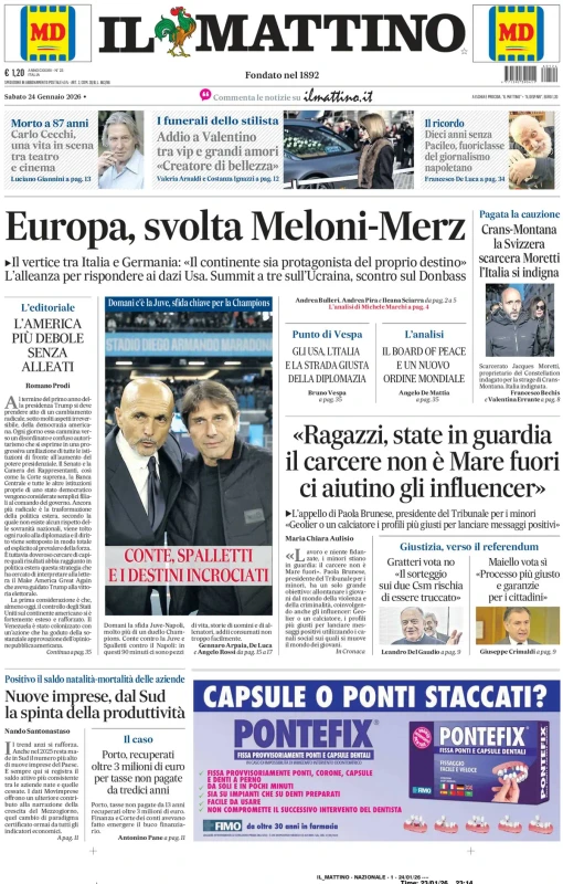 Manca un giorno al big match dell'Allianz Stadium. La Juventus ospita un Napoli in emergenza infortuni. I ragazzi di Antonio Conte devono provare a restare nella scia dell'Inter, anche se ormai è molto lontana. L'obiettivo è comunque tenere lontano i bianconeri. "Conte, Spalletti e i destini incrociati", scrive in prima pagina Il Mattino. Ecco la rassegna stampa di sabato 24 gennaio 2025.