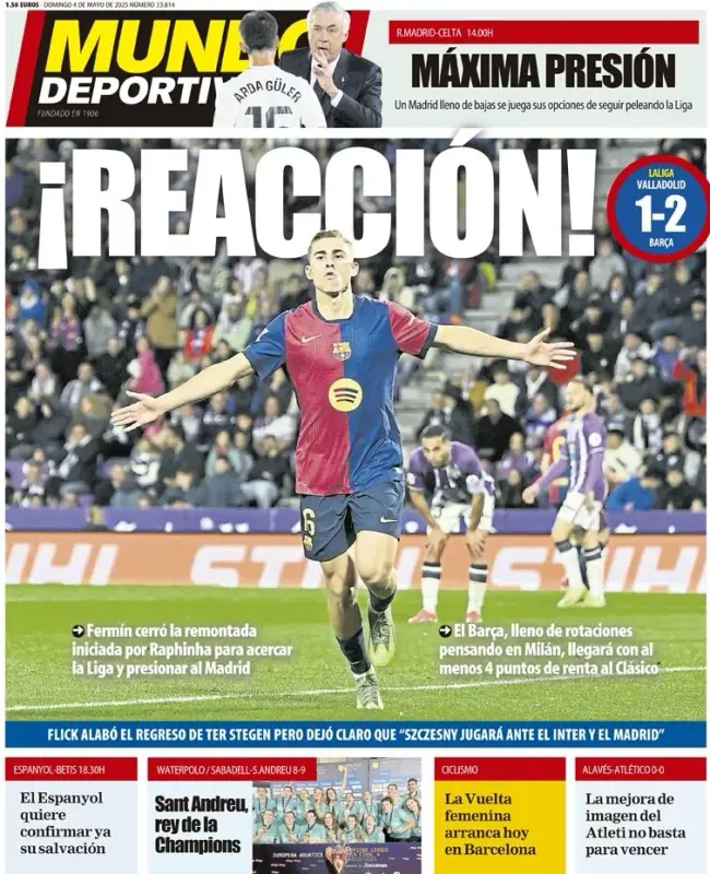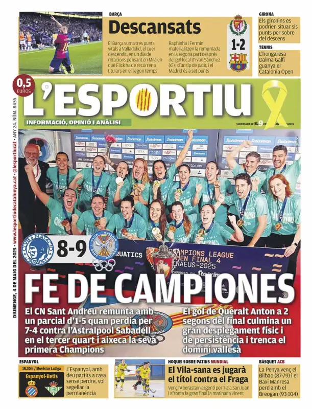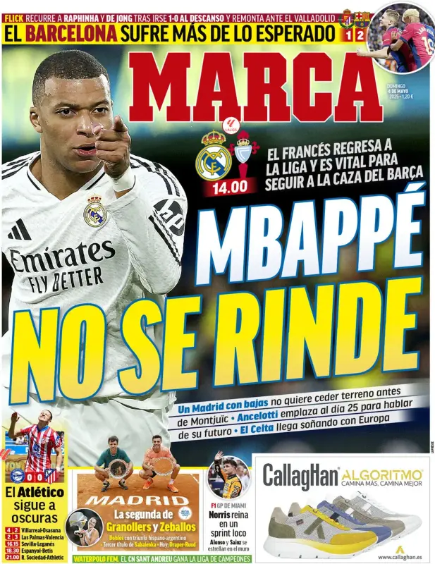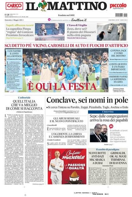 Il Napoli continua a sognare. Nella 35esima giornata di Serie A, gli azzurri vincono soffrendo a Lecce e si portano momentaneamnete a +6. Nella serata, l'Inter risponde e si riporta a -3 battendo l'Hellas Verona. "E' qui la festa", apre Il Mattino in prima pagina. Ecco la rassegna stampa di domenica 4 maggio 2025.