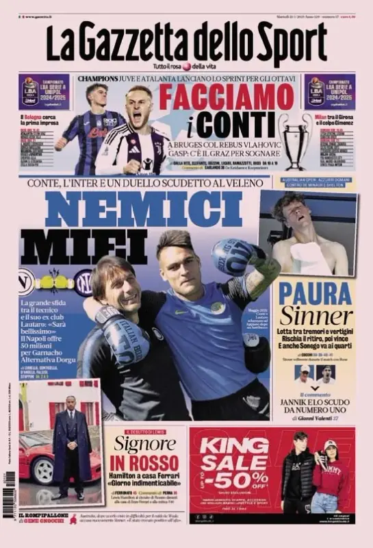 La Gazzetta dello Sport propone in prima pagina un focus sulla lotta scudetto tra Napoli ed Inter: "Nemici miei: Conte, l'Inter e un duello scudetto al veleno".