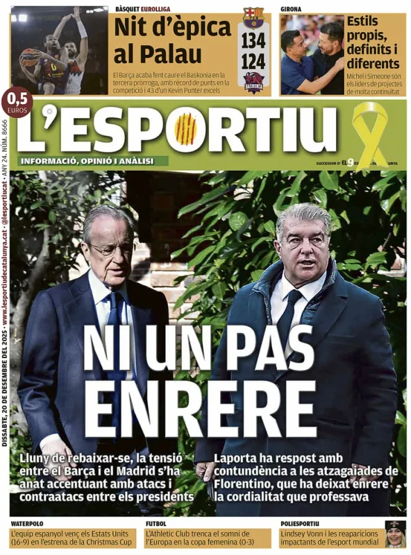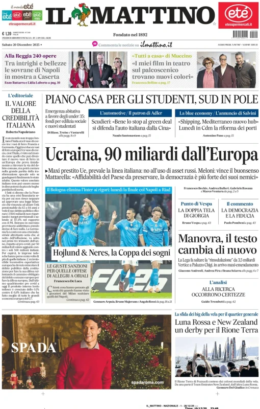 Napoli e Bologna finaliste della Supercoppa italiana. Questo e molto altro sulle prime pagine dei quotidiani nazionali e sportivi in edicola sabato 20 dicembre 2025. Il Mattino apre con "Hojlund & Neres, la Coppa dei sogni". Il Bologna elimina l'Inter ai rigori: lunedì la finale col Napoli a Riyadh. Poi il commento "le giuste sanzioni per quelle offese di Allegri a Oriali".