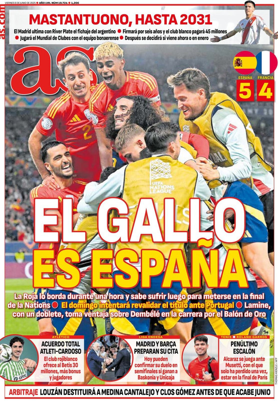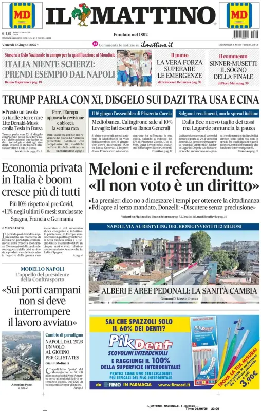 Finito il campionato, è tempo di nazionali. Mentre si gioca la fase finale della Nations League, che vedrà Portogallo e Spagna in finale, l'Italia è attesa all'impegno con la Norvegia per le qualificazioni ai mondiali. "Italia, niente scherzi, prendi esempio dal Napoli, la vera forza superare le emergenze", scrive nel taglio alto della prima pagina Il Mattino. Ecco la rassegna stampa di venerdì 6 giugno 2026.