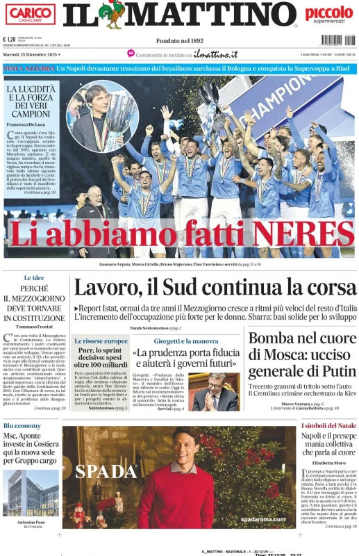 Il Mattino apre parlando della vittoria del Napoli nella Supercoppa Italiana: "Li abbiamo fatti Neres. Un Napoli devastante trascinato dal brasiliano surclassa il Bologna e conquista la Supercoppa Italiana a Riad".