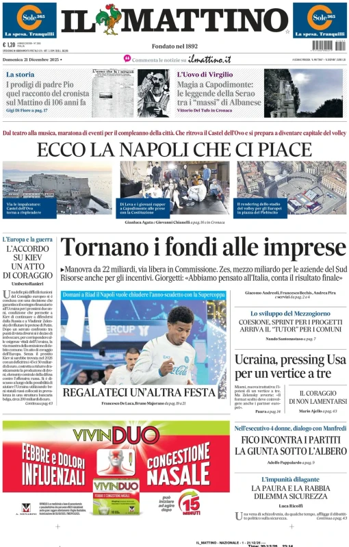 Vigilia della finale di Supercoppa italiana. Cresce l'attesa per l'atto finale della Final Four di Riyadh, che vedrà la sfida tra Napoli e Bologna. Gli azzurri hanno conquistato la finale vincendo 2-0 contro il Milan, mentre il Bologna ha sconfitto l'Inter ai calci di rigore. "A Riyadh il Napoli vuole chiudere l'anno-scudetto con la Supercoppa, regalateci un'altra festa", si legge sulla prima pagina de Il Mattino. Ecco la rassegna stampa di domenica 21 dicembre 2025.