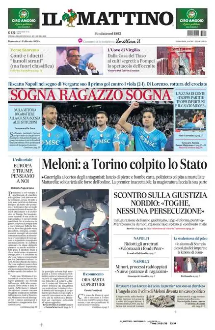 Il Napoli riprende il proprio cammino in campionato battendo 2-1 la Fiorentina. A decidere il match, i gol di Vergara e Gutierrez, entrambi al primo centro in Serie A. "Sogna ragazzo sogna", scrive in prima pagina Il Mattino, riferendosi proprio all'attaccante di Frattaminore, che sta facendo le fortune di un Napoli decimato dagli infortuni. Ecco la rassegna stampa di domenica 1 febbraio 2026.