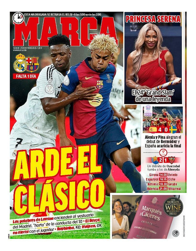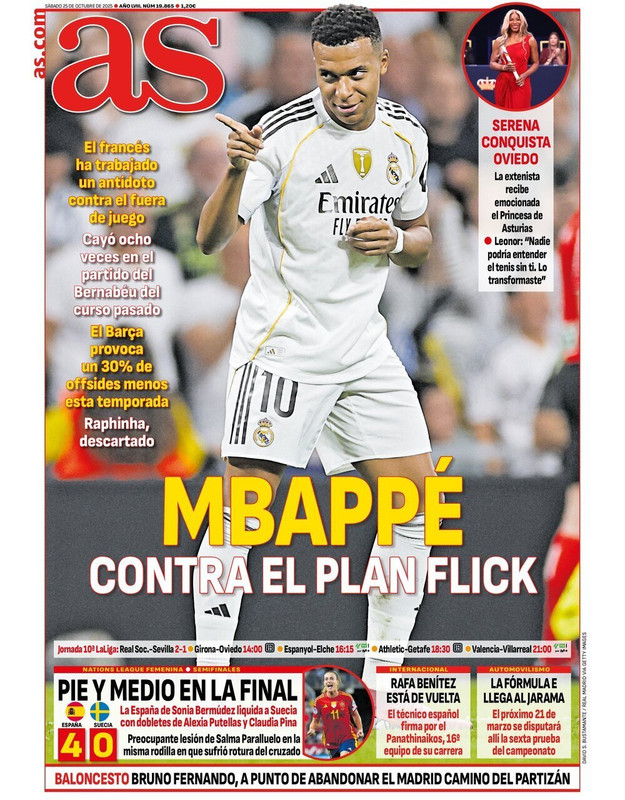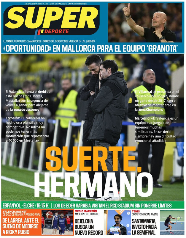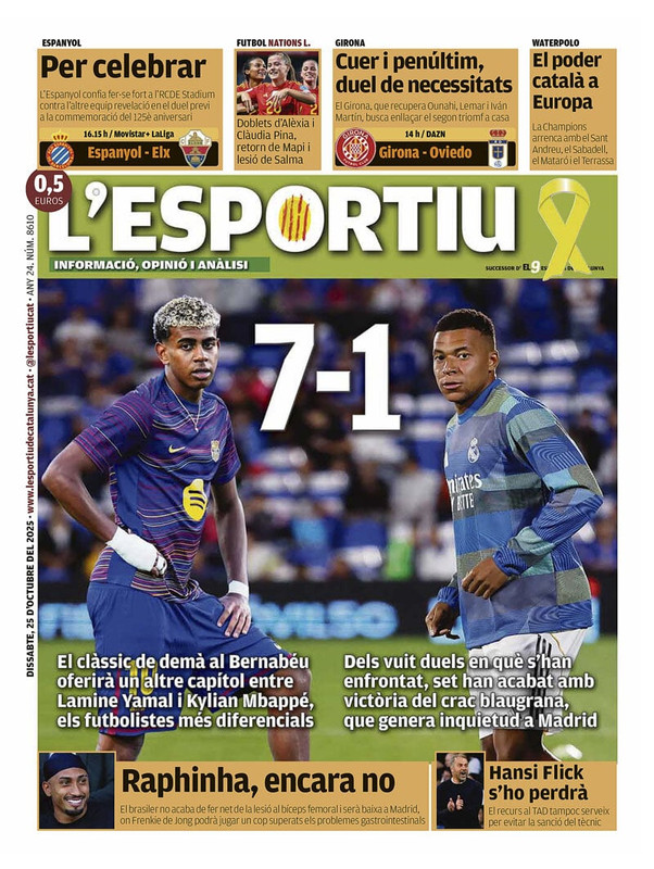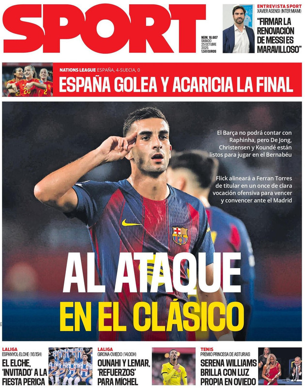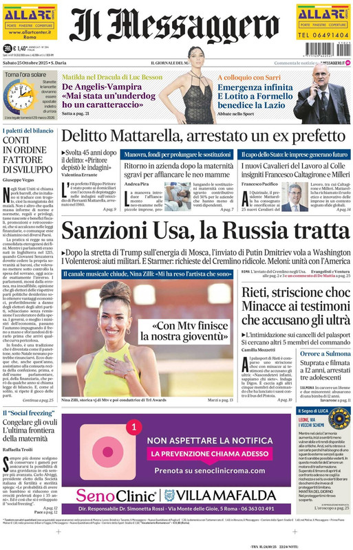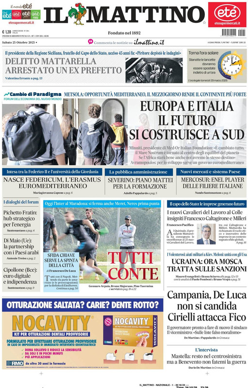 Il big match al Maradona tra Napoli e Inter, il programma dell'ottava giornata di Serie A e molto altro sulle prime pagine dei quotidiani nazionali e sportivi in edicola sabato 25 ottobre 2025. Il Mattino apre con "Tutti Con-te". Oggi l'Inter al Maradona: si ferma anche Meret. Neres prima punta. Sfida chiave, serve la spinta della città.