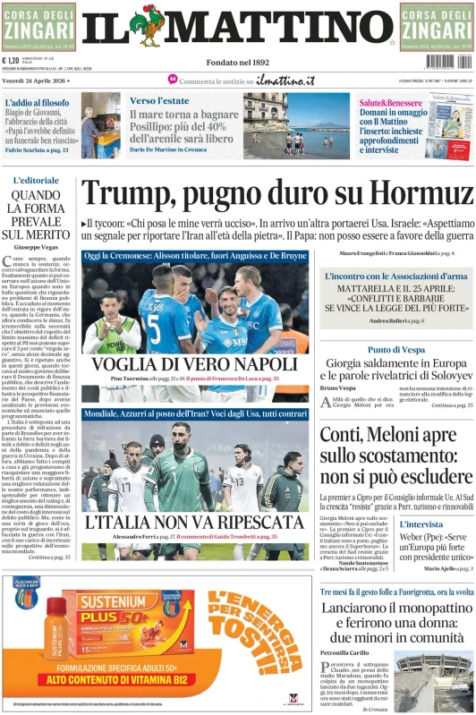 Il Mattino apre con un focus sul Napoli: "Voglia di vero Napoli. Oggi la Cremonese: Alisson titolare, fuori Anguissa e De Bruyne". Approfondimento anche sulla Nazionale: "L'Italia non va ripescata. Mondiale, Azzurri al posto dell'Iran? Voci dagli USA, tutti contrari".