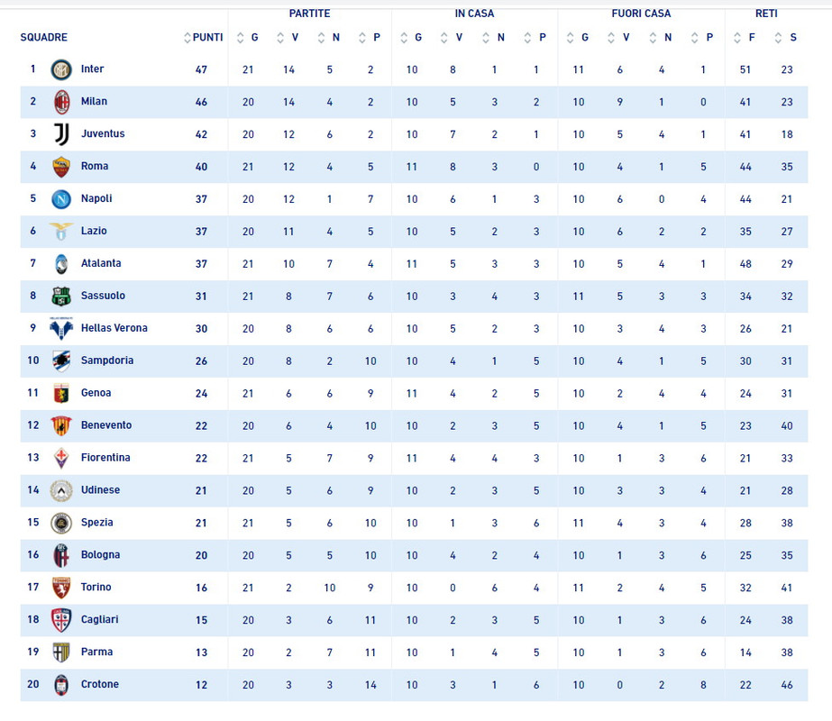 Dopo la sconfitta contro il Genoa, rimane ferma a 37 punti in classifica il Napoli di Gattuso, mentre la squadra di Ballardini sale a quota 24 e vede ormai come un lontano ricordo i tempi in cui si trovava in zona retrocessione. Ecco la classifica provvisoria del 21esimo turno.