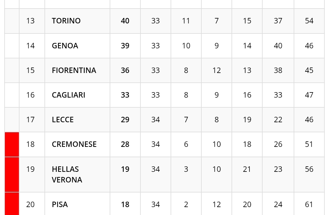Di seguito, la classifica provvisoria del 38° turno di Serie A. Dopo la vittoria contro la Lazio, il Napoli chiude la stagione al 7° posto a quota 62 punti.