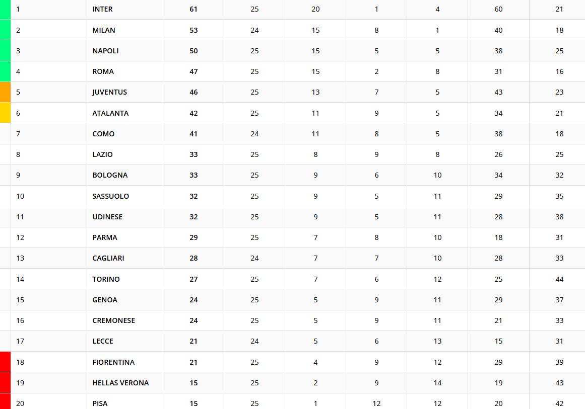 Termina 2-2 il match tra Napoli e Roma. Gli azzurri si portano a quota 50 punti, i giallorossi a 47 punti, a -3 dal Napoli. Ecco la classifica provvisoria della 25esima giornata di Serie A.