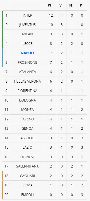 Il Lecce pareggia col Monza e sale al quarto posto, a quota 8 punti, portandosi a +1 dal Napoli. Con la vittoria in rimonta col Sassuolo, il Frosinone aggancia gli azzurri a quota 7 punti. Di seguito la classifica provvisoria.