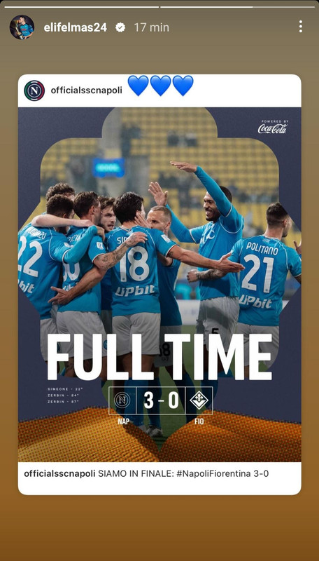 Eljif Elmas, ex centrocampista del Napoli, esulta su Instagram per la vittoria degli azzurri nella semifinale di Supercoppa italiana contro la Fiorentina, che ha regalato ai partenoperi la finale contro la vincente tra Inter e Lazio.