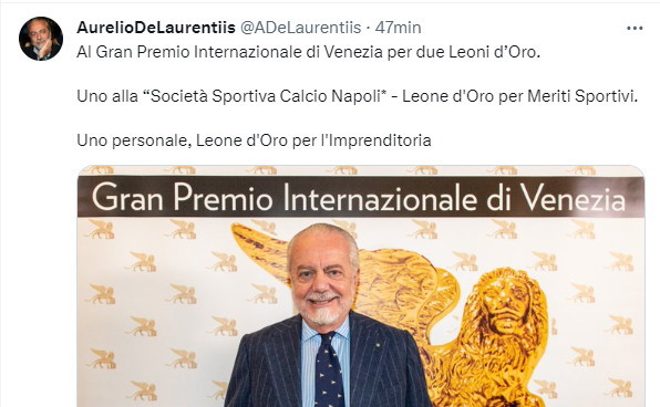 "Al Gran Premio Internazionale di Venezia per due Leoni d’Oro. Uno alla “Società Sportiva Calcio Napoli" - Leone d'Oro per Meriti Sportivi. Uno personale, Leone d'Oro per l'Imprenditoria", scrive il presidente del Napoli Aurelio De Laurentiis su X.