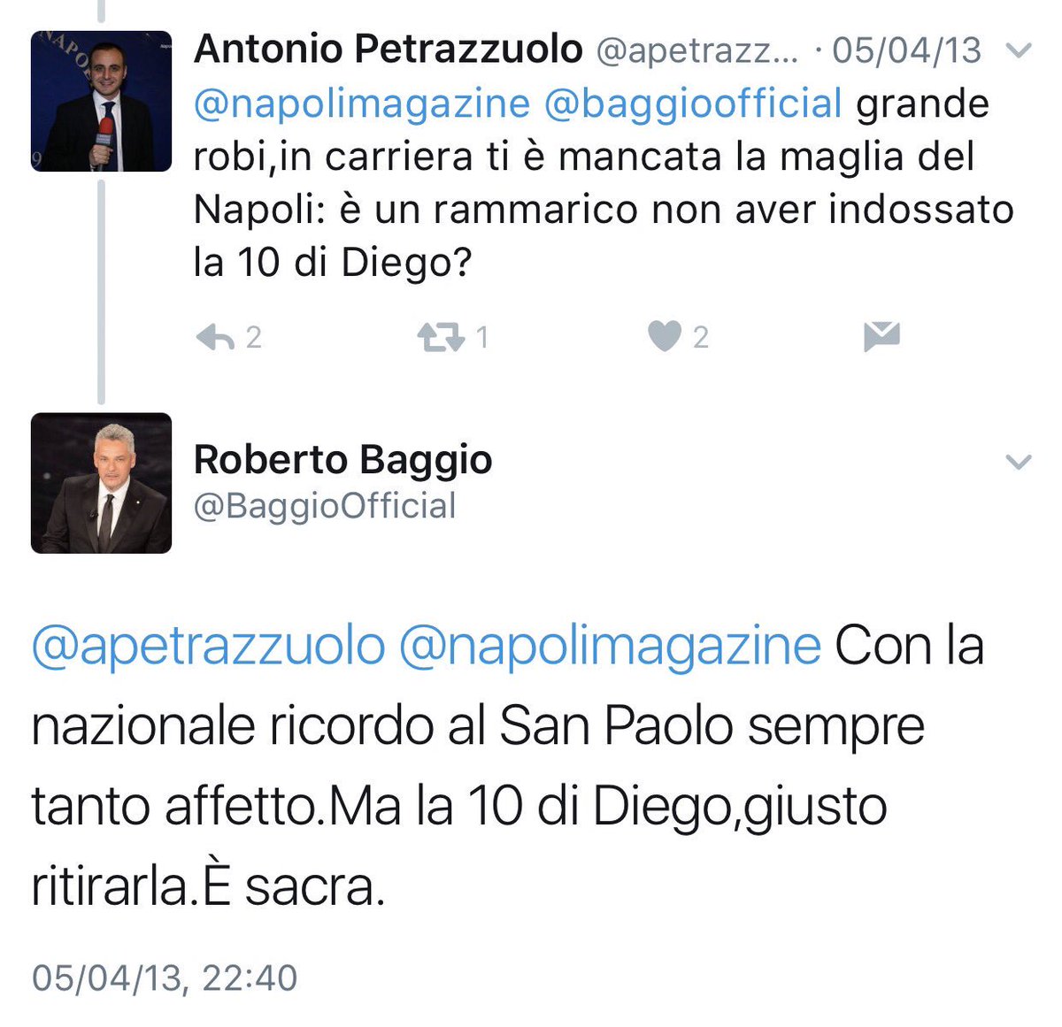 Scrive su Twitter Antonio Petrazzuolo, direttore di "Napoli Magazine": "Buon 50' compleanno a Roberto Baggio, un grande numero 10, che mi avrebbe fatto piacere vedere nel #Napoli #Baggio50".