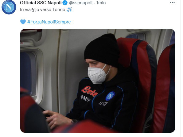 "In viaggio verso Torino #ForzaNapoliSempre", si legge sul canale Twitter della SSC Napoli dove è stata pubblicata una foto in cui c'è il centrocampista azzurro Piotr Zielinski in aereo.