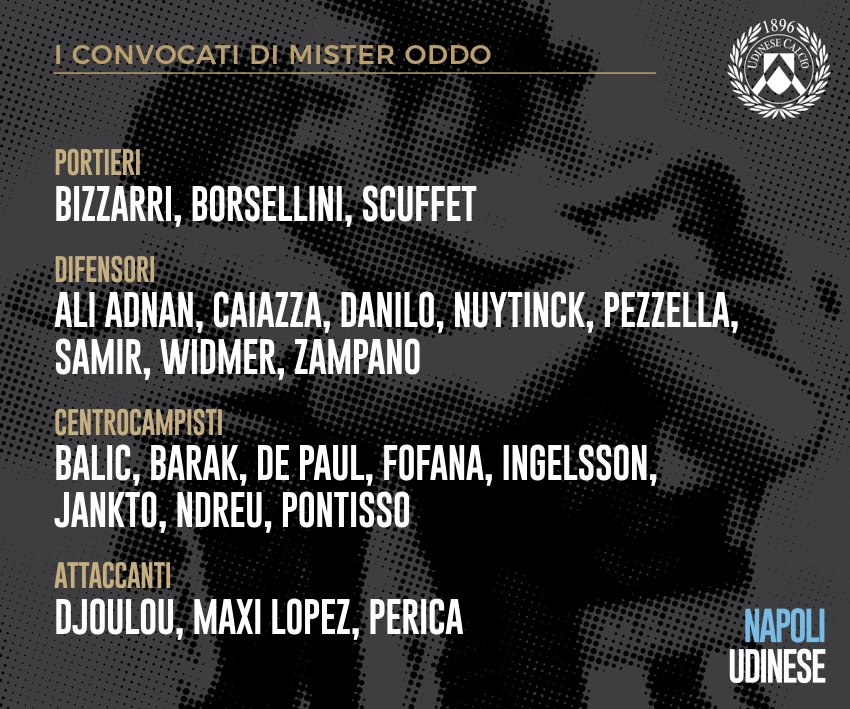 Nello schema pubblicato su Twitter dall'Udinese ecco i 22 convocati di mister Oddo per la gara in programma domani contro il Napoli.