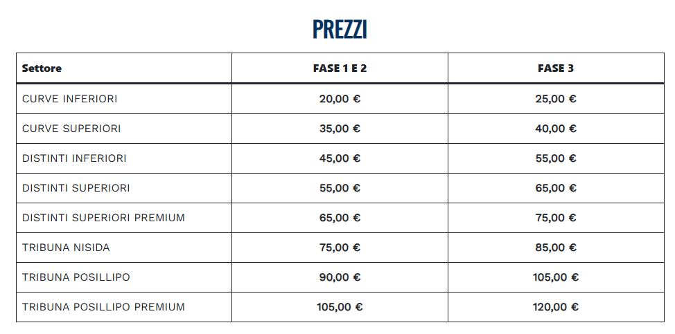 Dalle ore 12:00 di venerdì 6 Marzo 2026 e fino alle ore 23:59 di domenica 8 Marzo (ovvero, in ogni caso, fino ad esaurimento posti), i possessori di Fidelity Card “SSC Napoli Fan Stadium Card” potranno acquistare fino ad un massimo di 4 biglietti in prevendita, ad un prezzo ridotto rispetto a quello applicato durante la Fase 3 (Vendita Libera). I biglietti acquistati nel corso della Fase 1 dovranno necessariamente essere destinati a tifosi fidelizzati, sulle cui Fidelity Card saranno caricati i biglietti in formato digitale.