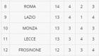 05.11 14:38 - SERIE A - La classifica provvisoria, il Monza vince e raggiunge la Lazio all'ottavo posto