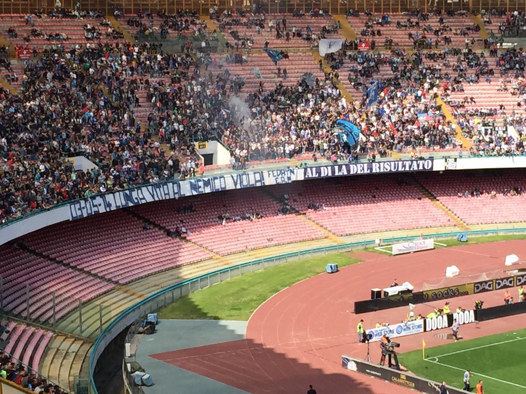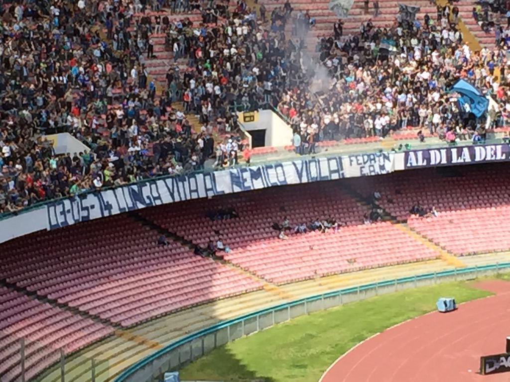 NAPOLI - "#NapoliFiorentina rispetto tra ultras in ricordo del 3 maggio #CiroEsposito", ecco 4 foto pubblicate su Twitter da "Napoli Magazine" in occasione del match giocato allo stadio San Paolo tra il Napoli e la Fiorentina. Nello striscione esposto al San Paolo si legge: "03/05/14 Lunga vita al nemico viola!".