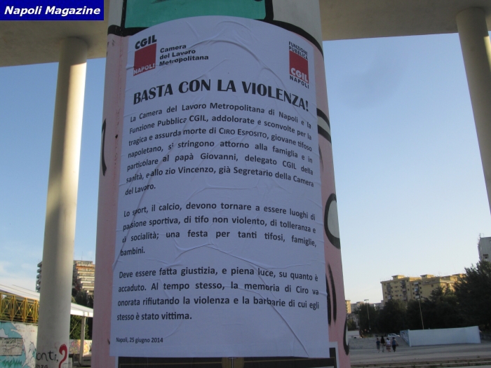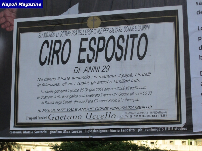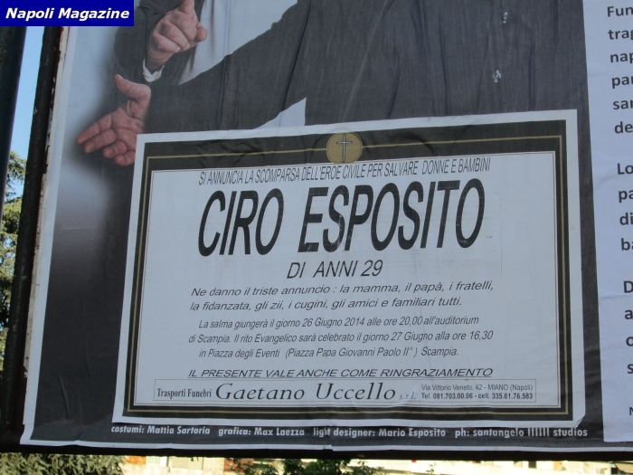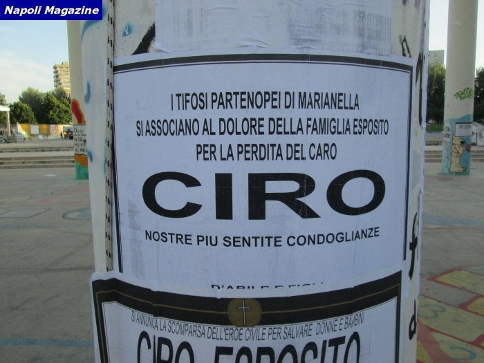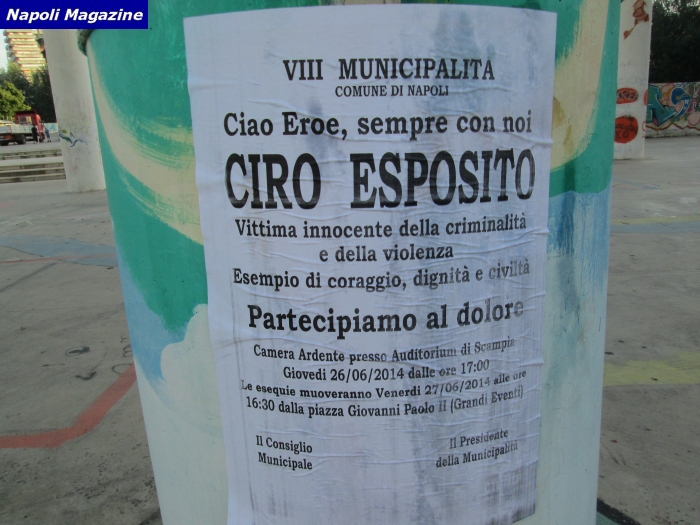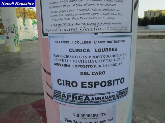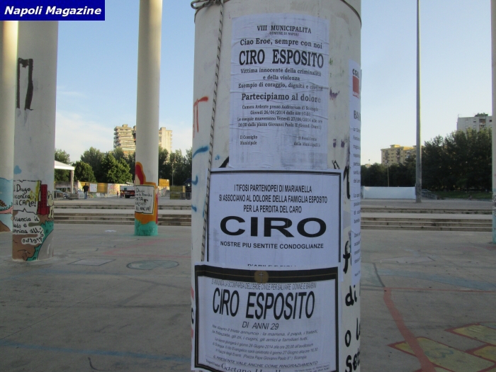 NAPOLI - "Napoli Magazine" ha realizzato 105 Foto a Scampia ed un video con l'applauso dedicato a Ciro Esposito nel momento in cui è stata esposta la sua gigantografia nella camera ardente. Focus in Piazza Grande Eventi, all'Auditorium, dove è stata allestita la camera ardente, e davanti all'abitazione del giovane tifoso del Napoli, di 29 anni, assassinato prima della finale di Coppa Italia del 3 maggio. Ecco tutti i manifesti dedicato a Ciro Esposito.