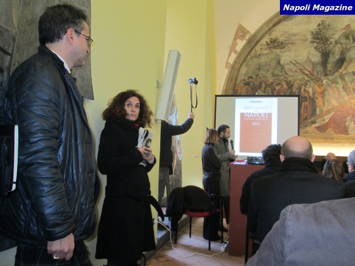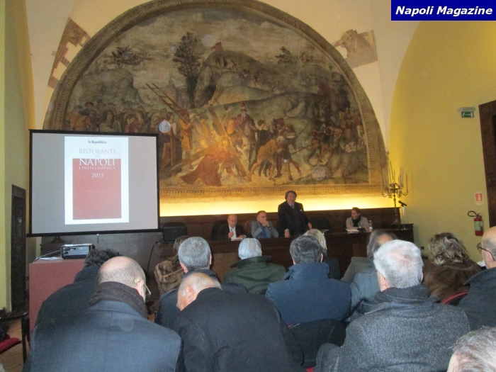 NAPOLI - C'è una Campania già in linea con l'Expo di Milano. "Nutrire il pianeta" è il tema della rassegna internazionale che racconterà al mondo l'Italia migliore. Da maggio a ottobre, per 184 giorni, saranno presentati i personaggi, i luoghi, i marchi, i prodotti del "Made in Italy". Venti milioni di visitatori in arrivo. Nessuna regione interpreta meglio della Campania il tema per le eccellenze del settore agroalimentare. E' stata presentata nel complesso monumentale di Santa Maria La Nova (in edicola al prezzo di 9,90 euro) la terza "Guida dei Ristoranti 2015" di "Repubblica". Accentua quest'anno la sua tendenza a segnalare modelli di sicurezza alimentare, salubrità, rispetto della natura e delle stagioni nell'universo campano del gusto. L'edizione del 2015 offre oltre 800 indirizzi selezionati in tutte e cinque le province campane, tra ristoranti, osterie storiche, pizzerie, street food, pub, agriturismi. Aggiorna sezioni già note al pubblico: pasticcerie, gelaterie, botteghe del gusto, pastifici, caseifici, allevamenti per formaggi Dop. Riferisce dimensioni, metodiche, strategie commerciali di produttori di olio e vino premiati dall'export su nuovi mercati, come Brasile e Asia. Con l'aiuto di studiosi qualificati come Luigi Frusciante della Facoltà di Agraria e delle ricercatrici Patrizia Spigno e Rosa Pepe, la Guida 2015 si sofferma sui prodotti di Campania Felix. La loro presenza nell'antichità, ma anche i risultati dei nuovi studi. Il volume vi rimarrà a lungo nelle aree di interesse turistico. È realizzato da sei giornalisti: Mario Basile, Donatella Bernabò Silorata, Paolo De Luca, Ilaria Urbani e Alessandro Vaccaro guidati da Antonio Corbo. Non sono indicati in voti, cappelli, forchette o bottiglie le graduatorie di merito: la Guida come le due precedenti non giudica, ma informa. Descrive personaggi, locali, aziende nei minimi particolari. La selezione avviene in base alla salubrità di piatti o prodotti, ecco perché spesso sono richiesti a ristoratori, osti, titolari di pizzerie e pub anche i nomi delle aziende che forniscono le materie prime. Sulla tecnica sofisticata, sulla chimica, sugli inquietanti segreti di certe cucine sono privilegiati il culto nella natura, il rispetto delle stagioni, la prova della tracciabilità. Le carni italiane su quelle estere. La ricerca consente di segnalare i caseifici che ogni giorno consegnano ai mercati mozzarelle neanche sfiorate da sospetti, né da indagini della magistratura, mai denunciati per frode, ma che abbiano superato indenni i rigorosi controlli di Nas e Forestale. La guida aiuta a conoscere in anteprima borghi da visitare e amare per la qualità dell'offerta agroalimentare. Da uno di questo noto per aver promosso il "turismo rurale" - Morigerati, nel cuore del Cilento - deriva la novità assoluta della Guida. Unica nel suo genere anticipa un dossier della ricercatrice Dionisia De Santis sulle "erbe spontanee": in coincidenza con l'Expo saranno illustrate a Morigerati in un congresso. Alcune destano interesse per i principi attivi preminenti: secondo le ricerche, riducono malattie gravi, concorrono a salute e bellezza. In anteprima le leggerete sulla Guida 2015. "Napoli Magazine" ha realizzato 85 Foto, in occasione della presentazione, con Antonio Corbo, Marino Niola e Giustino Fabrizio.